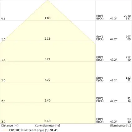 Der Abstrahlwinkel bezeichnet den Winkel, in dem das Licht aus der Lichtquelle ausgestrahlt wird. Er wird in Grad (D) angegeben. Je geringer die Gradzahl des Abstrahlwinkels ist, desto kleiner ist auch der Durchmesser des Lichtkegels, den die Lichtquelle produziert. Beispiel: Wird eine Lampe mit einem Abstrahlwinkel von 60 Grad an der Decke (2,5 m Höhe) angebracht, erzeugt sie einen Lichtkegel von 2,9 Metern Durchmesser. Hat die Lampe hingegen einen Abstrahlwinkel von 120 Grad, beträgt der Lichtkegel 8,7 Meter im Durchmesser. |