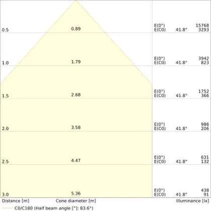 Der Abstrahlwinkel bezeichnet den Winkel, in dem das Licht aus der Lichtquelle ausgestrahlt wird. Er wird in Grad (D) angegeben. Je geringer die Gradzahl des Abstrahlwinkels ist, desto kleiner ist auch der Durchmesser des Lichtkegels, den die Lichtquelle produziert. Beispiel: Wird eine Lampe mit einem Abstrahlwinkel von 60 Grad an der Decke (2,5 m Höhe) angebracht, erzeugt sie einen Lichtkegel von 2,9 Metern Durchmesser. Hat die Lampe hingegen einen Abstrahlwinkel von 120 Grad, beträgt der Lichtkegel 8,7 Meter im Durchmesser. |