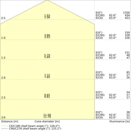 Der Abstrahlwinkel bezeichnet den Winkel, in dem das Licht aus der Lichtquelle ausgestrahlt wird. Er wird in Grad (D) angegeben. Je geringer die Gradzahl des Abstrahlwinkels ist, desto kleiner ist auch der Durchmesser des Lichtkegels, den die Lichtquelle produziert. Beispiel: Wird eine Lampe mit einem Abstrahlwinkel von 60 Grad an der Decke (2,5 m Höhe) angebracht, erzeugt sie einen Lichtkegel von 2,9 Metern Durchmesser. Hat die Lampe hingegen einen Abstrahlwinkel von 120 Grad, beträgt der Lichtkegel 8,7 Meter im Durchmesser. |