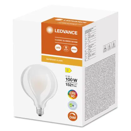 Die Ledvance Superior Classic LED E27 Globe Matt 11W 1521lm - 940 Kaltweiß | Höchste Farbwiedergabe ist eine effiziente E27 LED-Lampe und der perfekte Ersatz für Ihre konventionellen 100W Lampen mit E27-Sockel. Zudem strahlt sie Licht in der Farbtemperatur 4000K - Kaltweiß aus und punktet durch eine lange Lebensdauer.