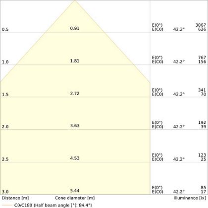 Der Abstrahlwinkel bezeichnet den Winkel, in dem das Licht aus der Lichtquelle ausgestrahlt wird. Er wird in Grad (D) angegeben. Je geringer die Gradzahl des Abstrahlwinkels ist, desto kleiner ist auch der Durchmesser des Lichtkegels, den die Lichtquelle produziert. Beispiel: Wird eine Lampe mit einem Abstrahlwinkel von 60 Grad an der Decke (2,5 m Höhe) angebracht, erzeugt sie einen Lichtkegel von 2,9 Metern Durchmesser. Hat die Lampe hingegen einen Abstrahlwinkel von 120 Grad, beträgt der Lichtkegel 8,7 Meter im Durchmesser. |