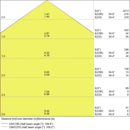 Der Abstrahlwinkel bezeichnet den Winkel, in dem das Licht aus der Lichtquelle ausgestrahlt wird. Er wird in Grad (D) angegeben. Je geringer die Gradzahl des Abstrahlwinkels ist, desto kleiner ist auch der Durchmesser des Lichtkegels, den die Lichtquelle produziert. Beispiel: Wird eine Lampe mit einem Abstrahlwinkel von 60 Grad an der Decke (2,5 m Höhe) angebracht, erzeugt sie einen Lichtkegel von 2,9 Metern Durchmesser. Hat die Lampe hingegen einen Abstrahlwinkel von 120 Grad, beträgt der Lichtkegel 8,7 Meter im Durchmesser. |