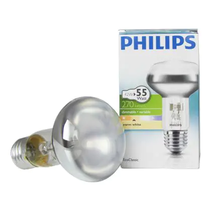 Philips EcoClassic Reflektor sind Halogenlampen mit mundgeblasenem Glas-Reflektoren. Diese Lampen bieten einen wirtschaftlichen Gewinn von 30% im Vergleich zu einer Glühlampe. Diese Lampen sind aufgrund des E27 Lampensockel einfach zu installieren und besitzen einen Durchmesser von 65 mm.