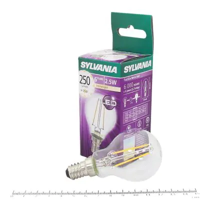 Die Sylvania ToLEDo Retro Ball E14 ist eine energieeffiziente LED-Lampe. Sie hat einen Eigenbedarf von nur 4 Watt, ersetzt dabei jedoch traditionelle Leuchtmittel von 40 Watt. Das ermöglicht eine Energieersparnis von 90 %. Darüber hinaus hat die LED einen E14-Sockel und ein kugelförmiges Design. Sie spendet extra warmweißes Licht mit einer Farbtemperatur von 2.700 Kelvin.
